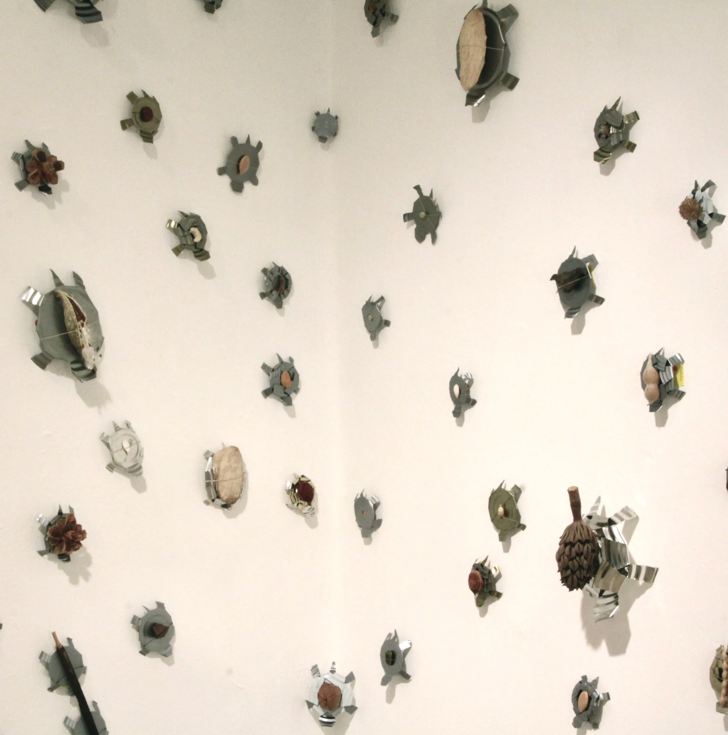 In this piece, “Movement on Turtle Island,” each seed becomes a world unto itself. Seeds become part of the turtles’ shells, microcosms of the cosmos carried on their backs. The seed-shells provide protective homes for the turtles and house the essence of the Earth’s botanical diversity. Carried by the ancient feet of the turtles, the seeds migrate en mass slowly but steadily towards survival, in response to global climate change.