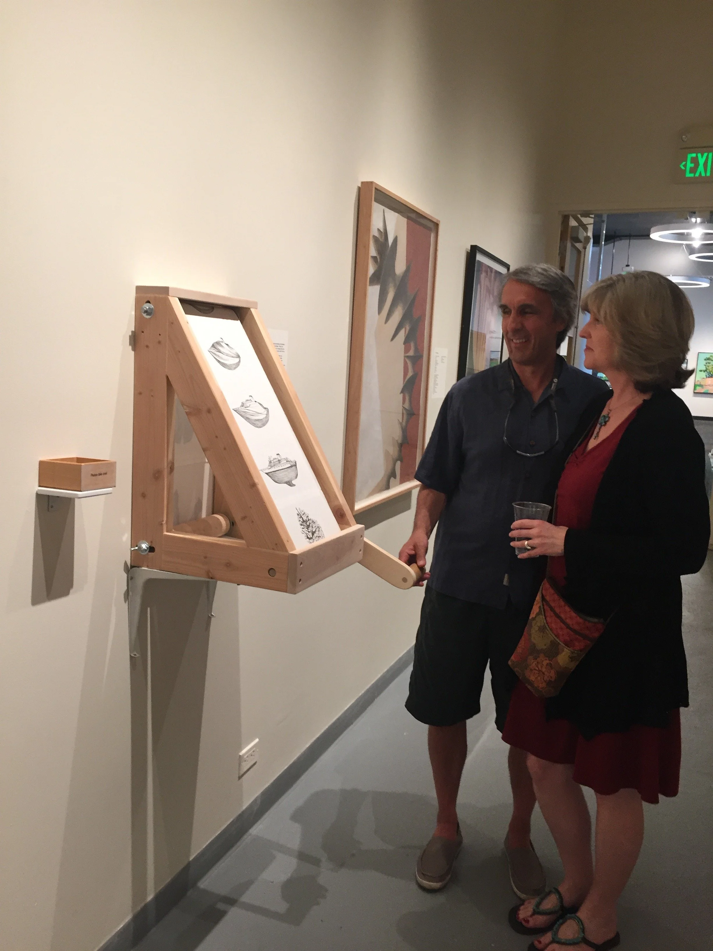 Medium: Pen and ink drawings printed on fabric, pine wood frame, rolling pins and hardware installed with 8 original interpretive drawings of biomimetics research