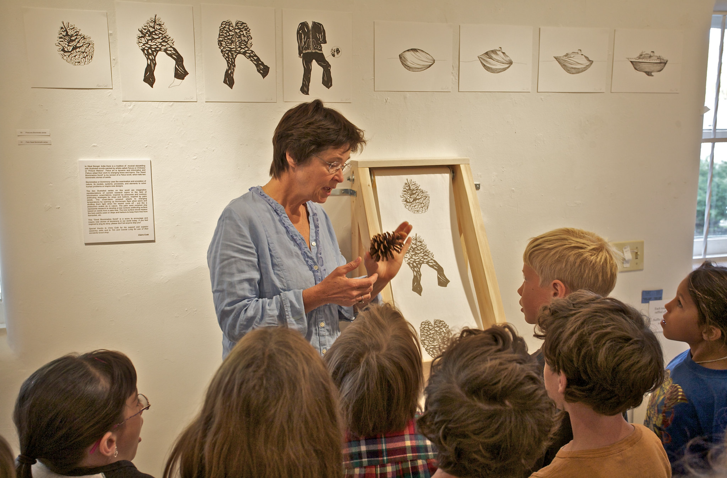 Scrolls have long been used around the world as receptacles of wisdom and story sharing. In West Bengal, India there is a tradition of performative storytelling with illustrated scrolls painted by hereditary artists called Patuas. Patua scrolls can be dynamic, informative and adaptive to changing times and topics. In Appalachia in the 19th Century stories or ballads were accompanied by “Crankies,” long, illustrated scrolls, in a carefully designed box with a hand-crank. Honoring the powerful form of the scroll and various linked traditions of storytelling, my “Seed Biomimetics Scroll” shares two biomimetic stories of seeds. Biomimetics or biomimicry uses the examination and emulation of nature, its models, systems, processes, and elements to solve human problems or inspire new designs. The two illustrated series on this scroll are imaginative representations of current research topics in the field of biomimetics: smart-fabrics, inspired by pinecones and nontoxic antifouling strategies for ships and harbors, inspired by palm seeds. This “Seed Biomimetics Scroll” is a score to encourage and inspire new stories of biomimcry in our world today.